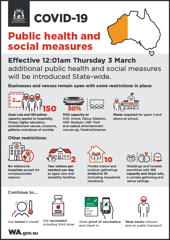 COVID-19- New Public Health and Social Measures Published on Monday, 28 February 2022 at 4:34:25 PM COVID-19- New Public Health and Social Measures The State Government has announced it will be making changes to COVID-19 Public health and social measures effective 12.01am Thursday 3 March. For more information click here: https://www.wa.gov.au/government/announcements/level-2-public-health-measures-introduced-state-wide-thursday-3-march Back to All News